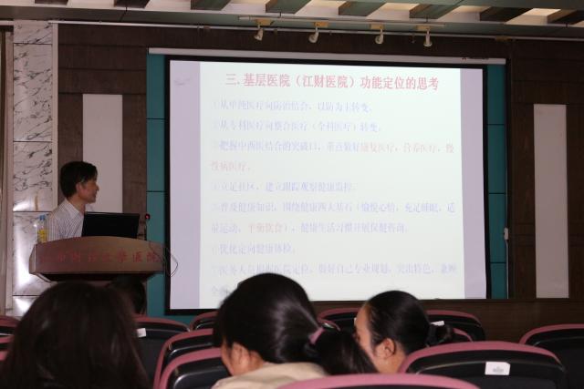 10月13日上午,医院老院长、资深的主任医师严军亮举行了一场内容丰富、演讲生动的《疾病诊断与治疗的再认识》的专题讲座。严院长从疾病的本质入手,在哲学的高度系统的讲述了疾病的诊断与治疗的再认识过程;从独特的角度定义了医生的价值和责任;对现在流行的医疗模式的现状和误区做了深刻分析、对中美医疗市场的情况做了比较;对基层医院(包括校医院)功能定位和发展提出了独到的设想。严院长已退居二线,但仍对医疗事业高度关注,仍心系校医院的改革发展和建设,其精神实属可贵。